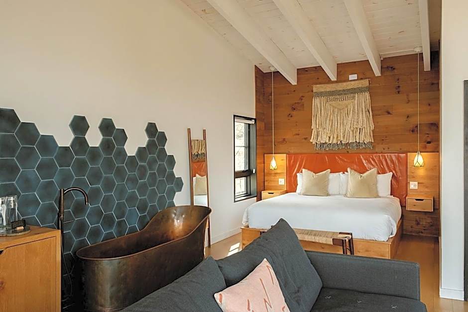 This room with 13 foot beamed ceilings, private outdoor space with tree top mountain views and waterfall sound features a living area with a sofa bed, mini refrigerator, 40" flat-screen TV, cable HBO/Showtime, safe and turntable with Bluetooth capabilities. The bathroom has a walk-in shower with rain shower head, hairdryer and heated bathroom floor.